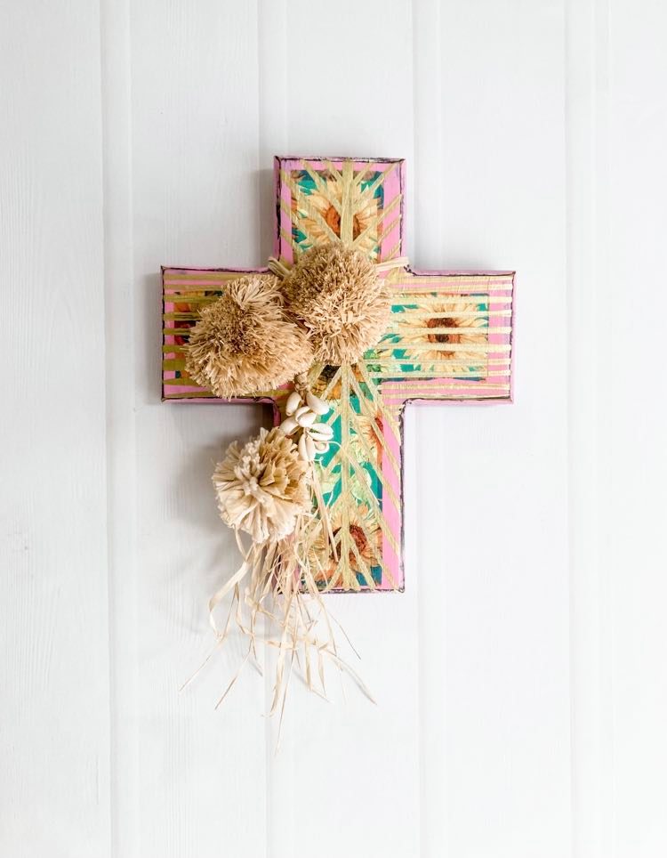 Description: Wooden wall cross handmade & hand painted by Her Soul. The finish is pink, gold, and turquoise with sunflowers and gold detailing. Some gentle distressing present for a weathered, vintage vibe. Sealed with a clear gloss topcoat.