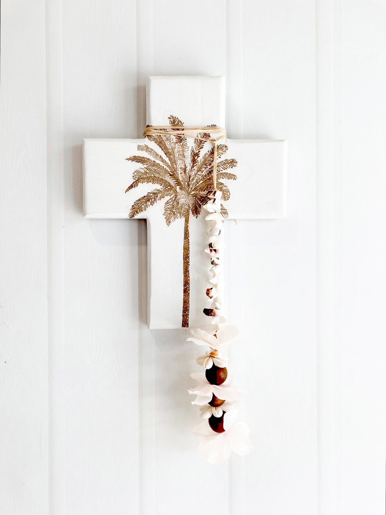Description: Wooden wall cross handmade & hand painted by Her Soul. The finish is white with brown palm tree. Sealed with a clear gloss topcoat.