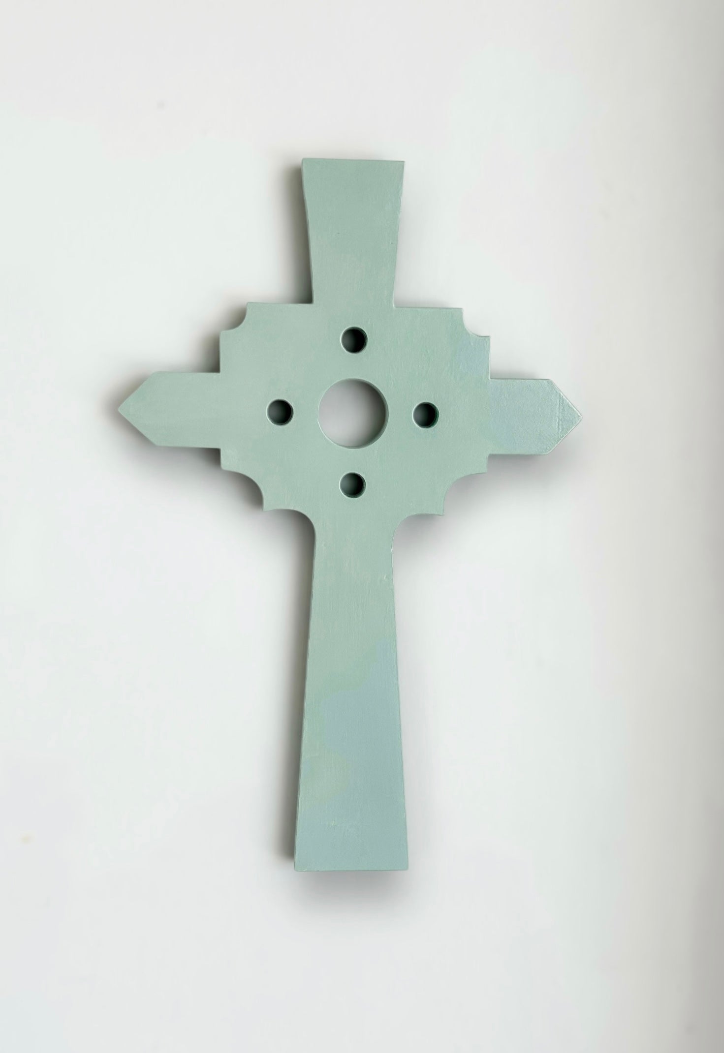 Description: Wooden wall cross handmade & hand painted by Her Soul. The finish is a beautiful sage green. The shape, which includes four smaller holes & larger center hole, is inspired by Moroccan homewares seen while traveling. The name for the design, “tbisaama”, is an Arabic word meaning “smile”. Sealed with a clear gloss topcoat.