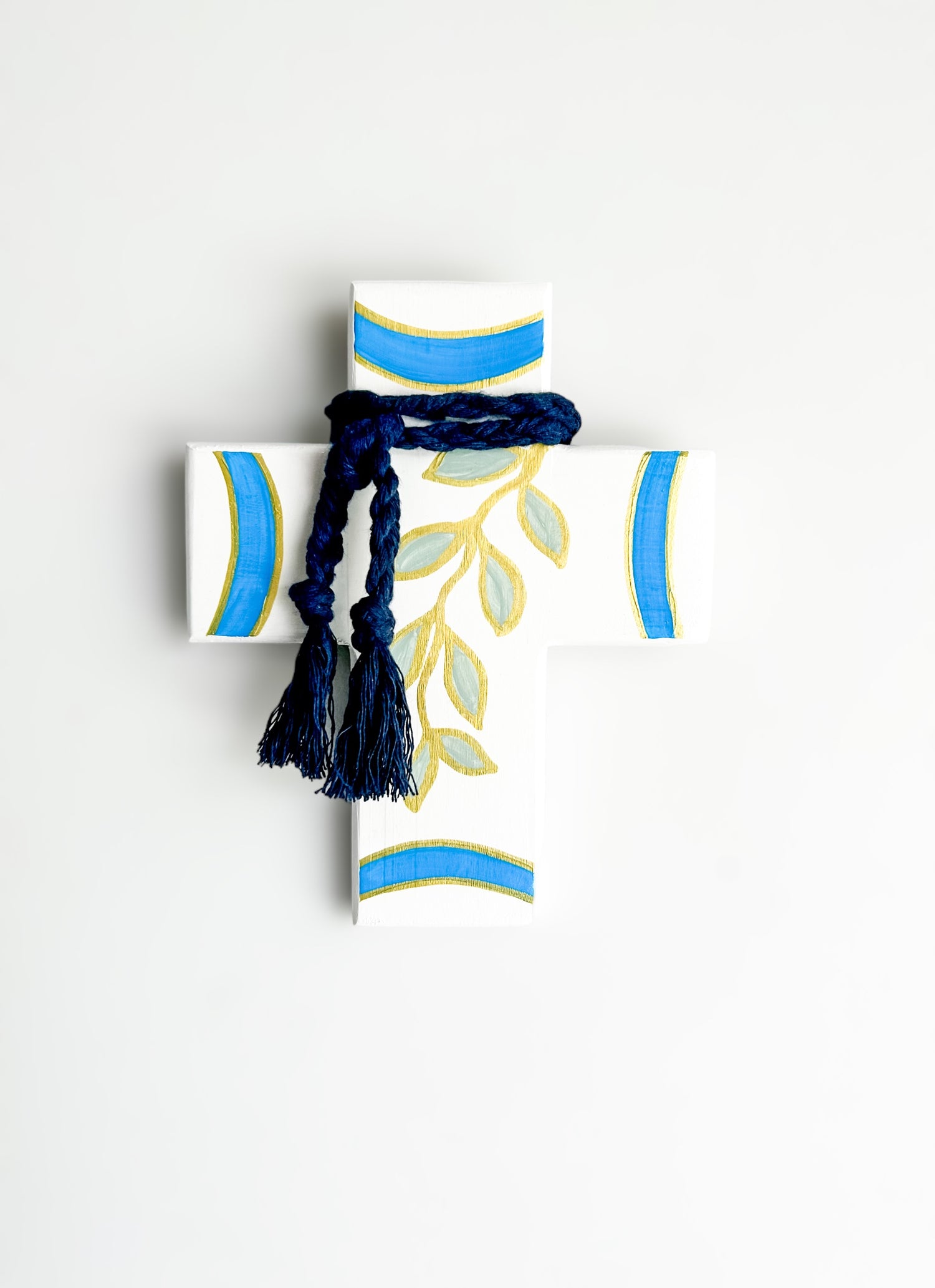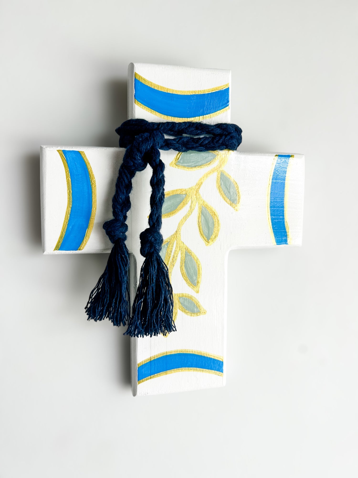 Description: Wooden wall cross handmade & hand painted by Her Soul. The finish is white with gold, blue & pastel sage. Sealed with a clear gloss topcoat.