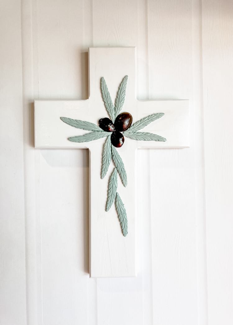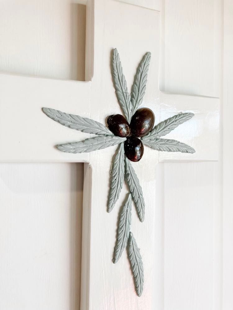 Description: Wooden wall cross handmade & hand painted by Her Soul. The finish is white with three dimensional brown olives & sage green leaves made from resin. The appearance of the olives & leaves will vary in size, shape & positioning due to the moulding process. Sealed with a clear gloss topcoat.
