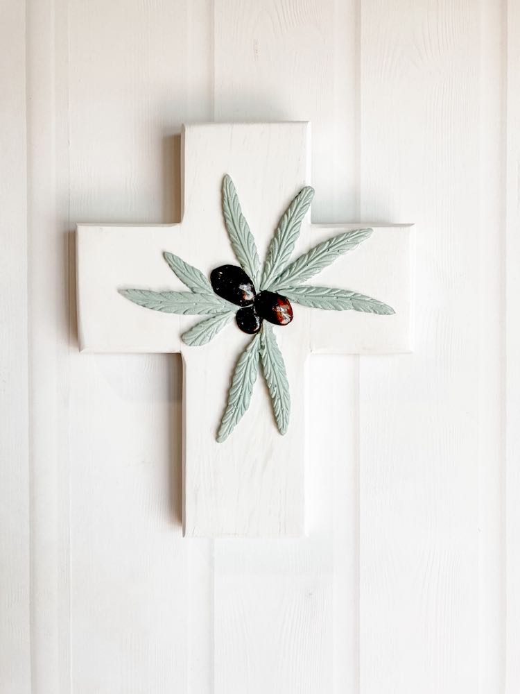 Description: Wooden wall cross handmade & hand painted by Her Soul. The finish is white with three dimensional brown olives & sage green leaves made from resin. The appearance of the olives & leaves will vary in size, shape & positioning due to the moulding process. Sealed with a clear gloss topcoat.
