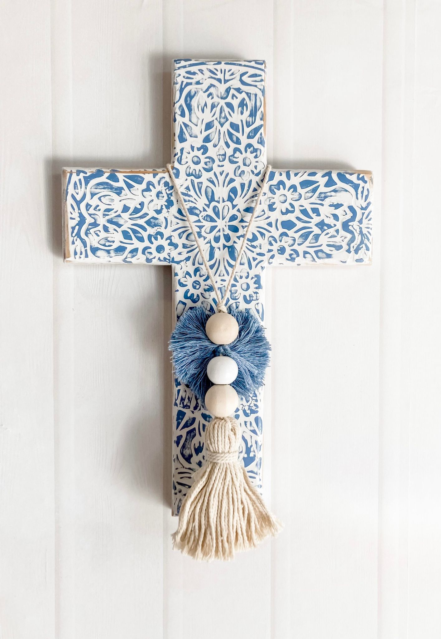 Description: Wooden wall cross handmade & hand painted by Her Soul. The finish is a raised, embossed pheeta pattern, giving it a carved look. Sealed with a clear gloss topcoat.