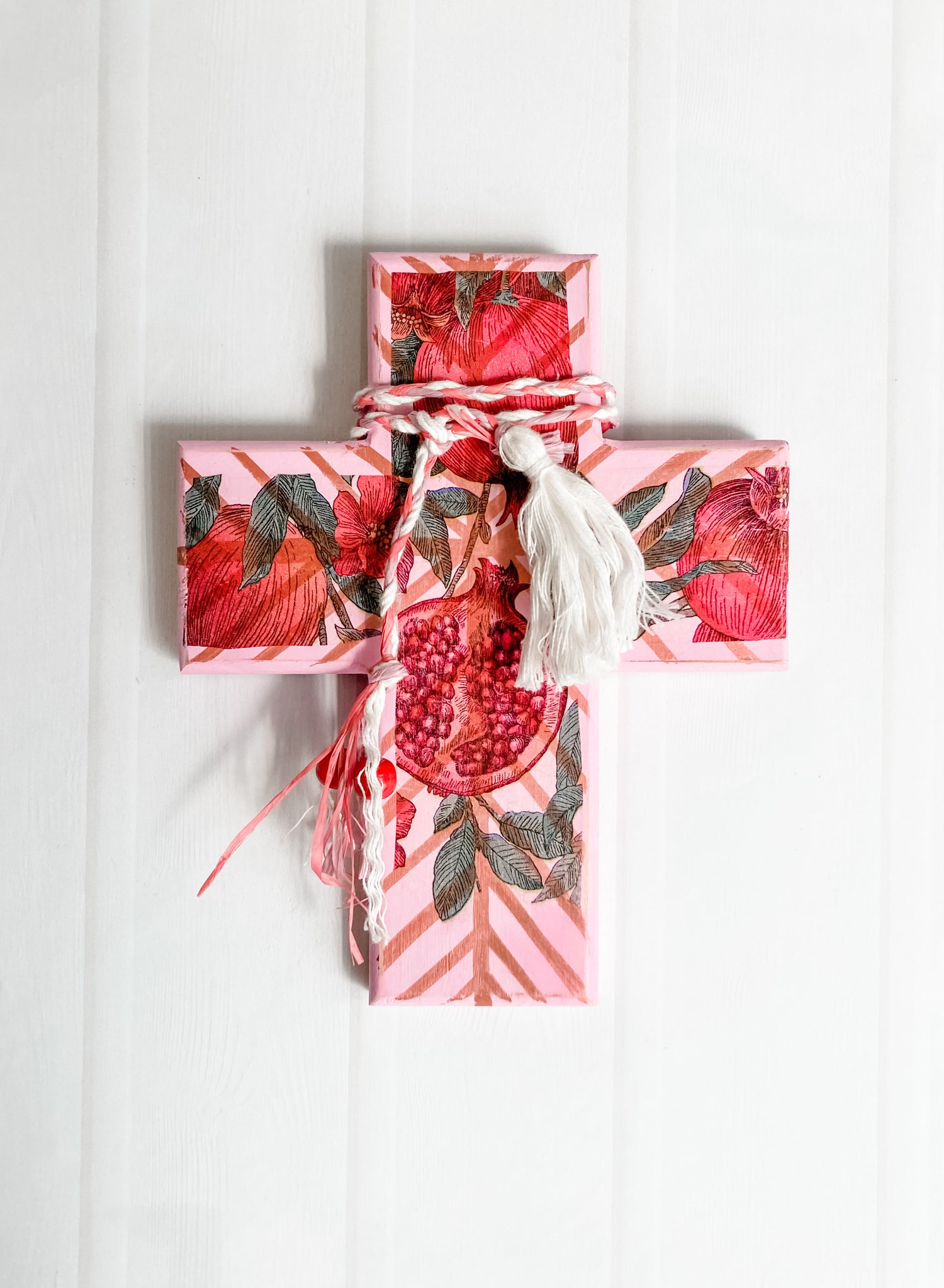 Description: Wooden wall cross handmade & hand painted by Her Soul. The finish is pink, a dark rose gold and red pomegranate design. Sealed with a clear gloss topcoat.