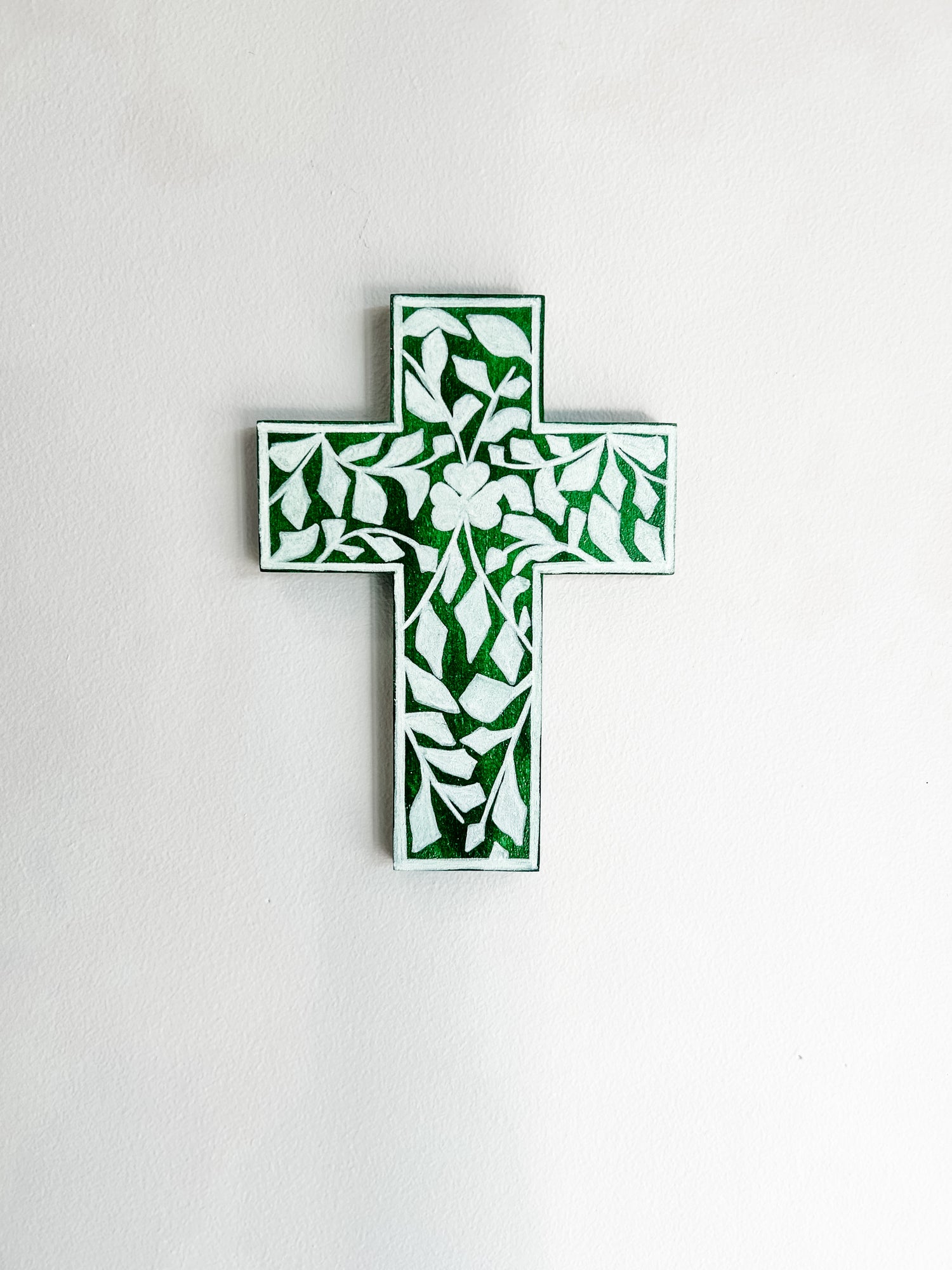 Description: Wooden wall cross handmade & hand painted by Her Soul. The finish is forest green and white. Sealed with a clear gloss topcoat.