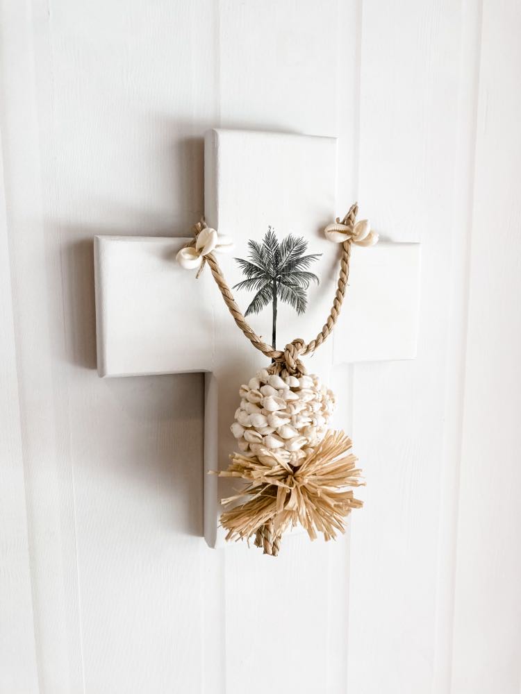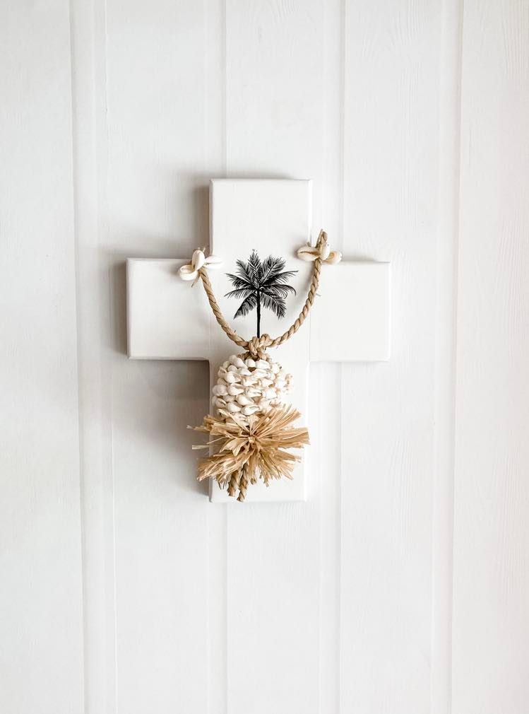 Description: Wooden wall cross handmade & hand painted by Her Soul. The finish is white with black palm tree. Sealed with a clear gloss topcoat.
