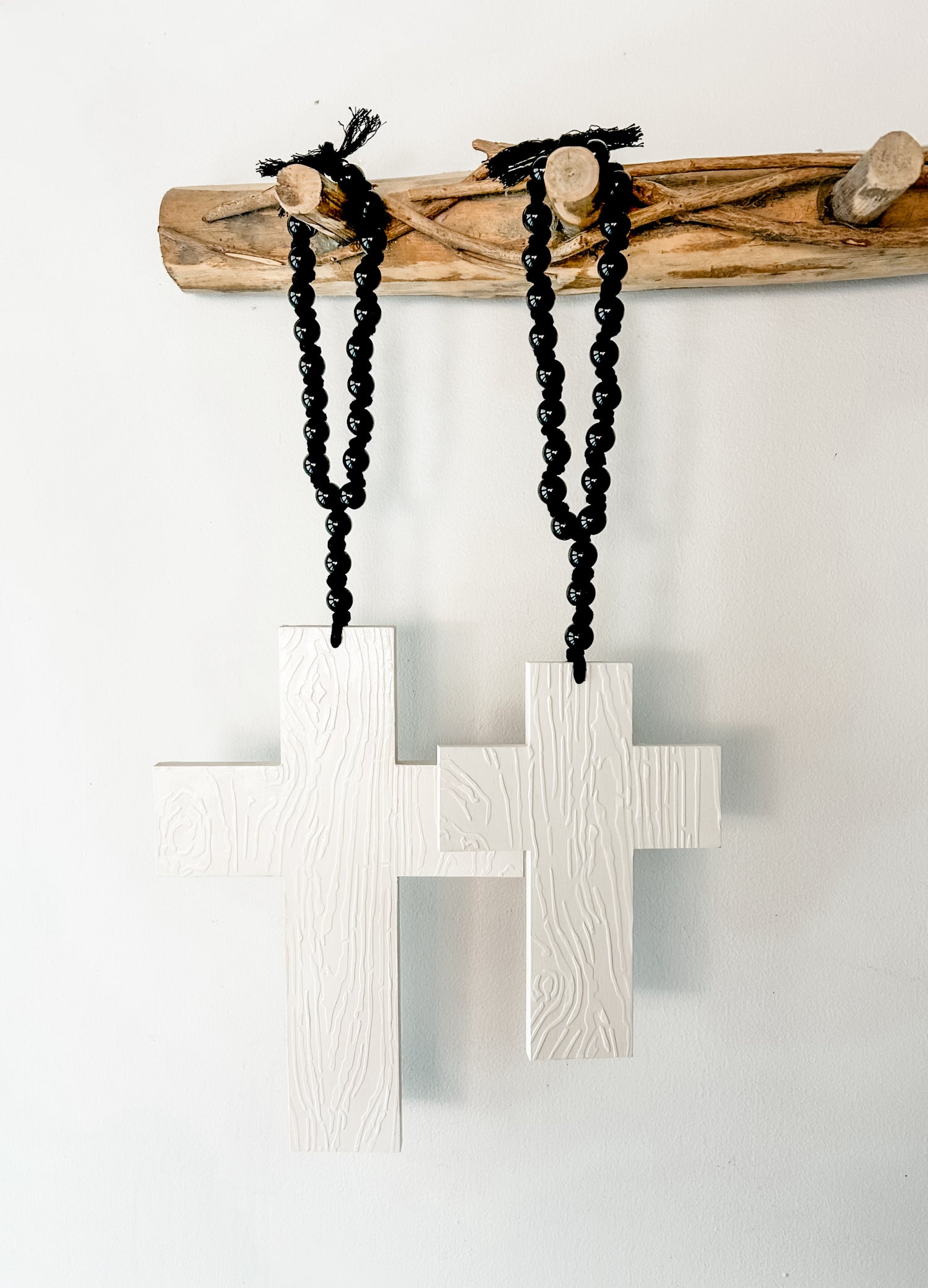 Description: Wooden wall cross handmade & hand painted by Her Soul. The finish is white on white, inspired by the wavy lines in driftwood. Sealed with a clear gloss topcoat.